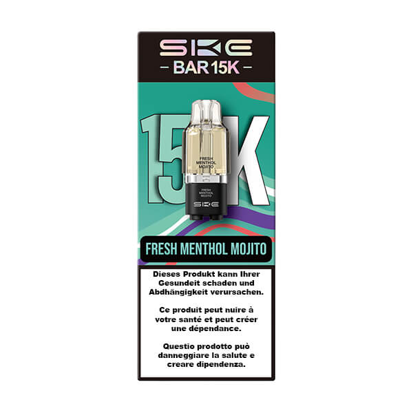- Grâce à son système ingénieux, la Cartouche SKE Bar 15K Fresh Menthol Mojito se glisse en quelques secondes dans la batterie et vous permet ainsi de remplacer facilement le pod et de varier les plaisirs gustatifs durant la journée.