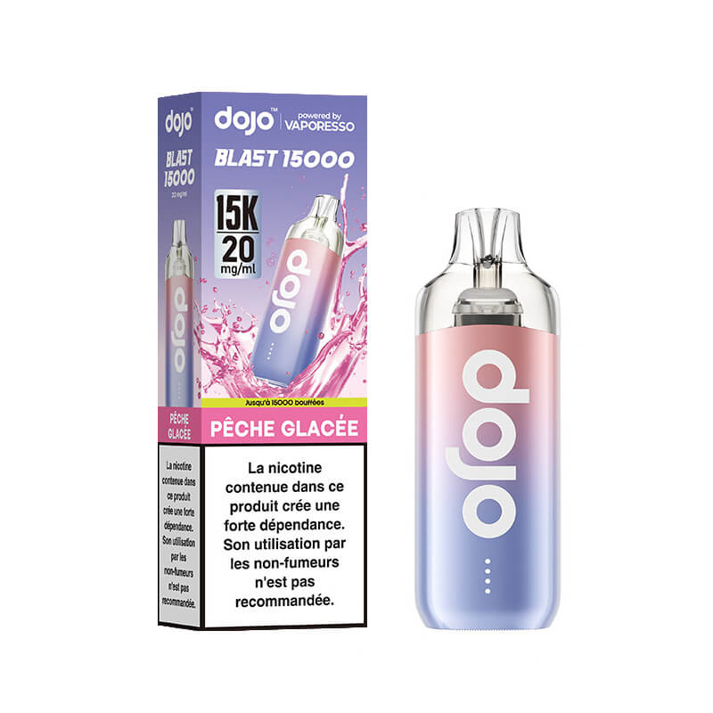 Puff Dojo Blast 15000 Pêche Glacée de Vaporesso. Ne jetez plus votre Puff ! Un Vape Pen durable, rechargeable et remplissable, prêt à l'emploi, pour une utilisation simple et pratique. Il se compose d'une batterie de 1000mAh rechargeable (câble USB vendu séparément), d'une cartouche remplaçable de 2ml et d'un flacon de recharge, clipsable, remplaçable et remplissable de 8ml pour une autonomie maximale. Lorsque le flacon de recharge de 8ml est vide, il peut être rempli avec des e-liquides de votre choix ou remplacé par une recharge Dojo Blast (vendue séparément). Il conviendra de remplacer la cartouche Dojo Blast 2ml par une nouvelle cartouche, lorsque la résistance scellée est usagée. La Puff Dojo Blast 15K Vaporesso Pêche Glacée propose un e-liquide rafraîchissant aux notes de pêche glacée. Elle fonctionne par activation automatique, en aspirant. La puff Vaporesso Dojo Blast Pêche Glacée offre environ 15000 bouffées. Une capacité améliorée grâce à la nouvelle résistance Corex Blast. Elle est proposée aux sels de nicotine, au taux de 20mg. Dimensions : 10.3cm x 3.6cm x 2.5cm. D'autres cartouches de saveurs sont proposées séparément.