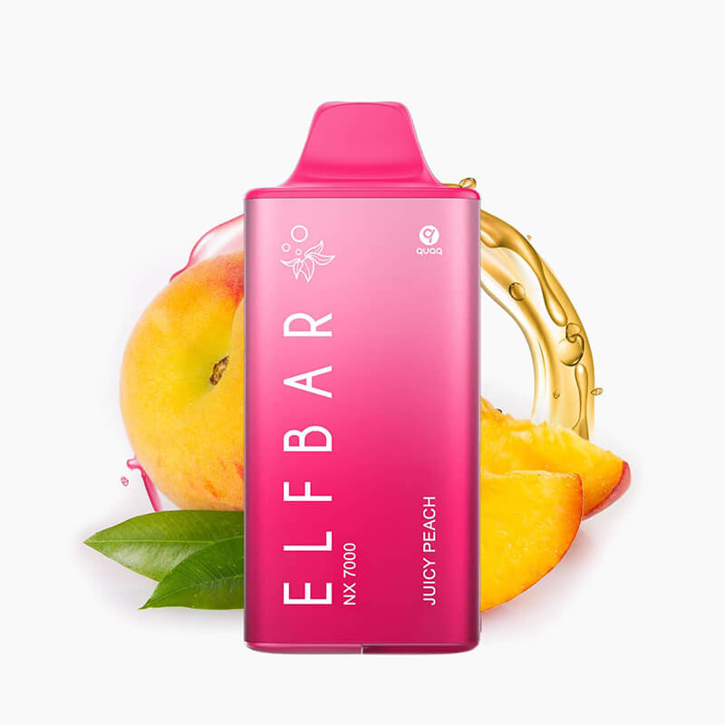 Puff NX 7000 Juicy Peach. Une e-cigarette rechargeable et remplissable, avec cartouche remplaçable, créée par Elfbar.