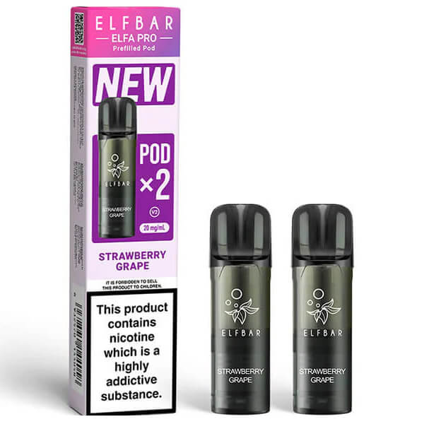 Packung mit 2 Elfa Pro Strawberry Grape Patronen, die mit der Elfa-Batterie zu verbinden, um Ihre Elfa Puff zu komponieren. Einwegpatronen, gefüllt mit e-Liquid mit Noten von Erdbeere und Traube, die von Elf Bar entwickelt wurden.