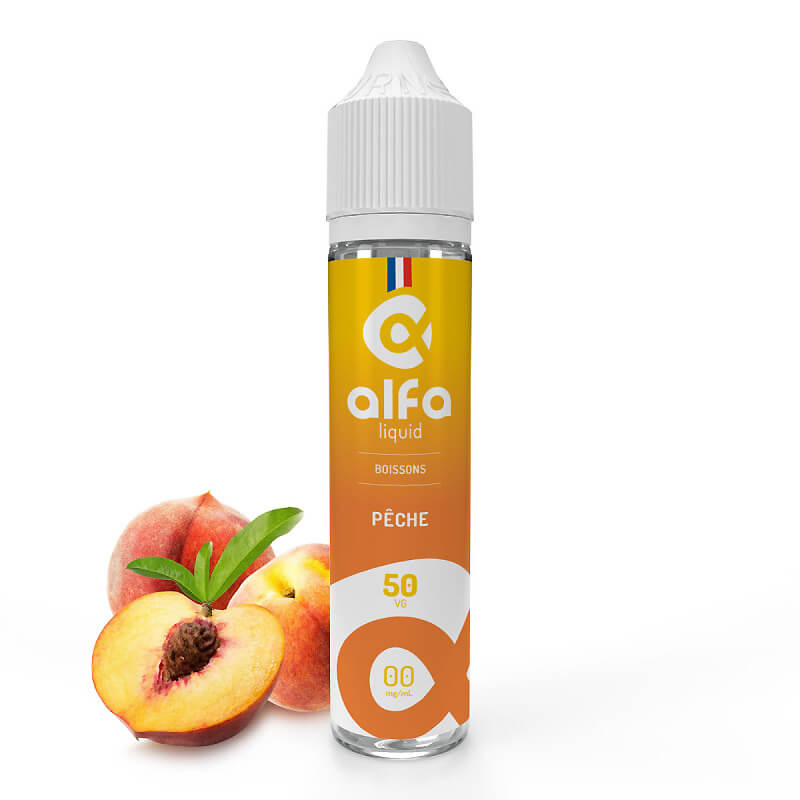 Le e liquide Pêche de Alfaliquid est proposé en 0mg, en 50ml dans un flacon de 70ml, pouvant accueillir 2 X 10ml de booster.