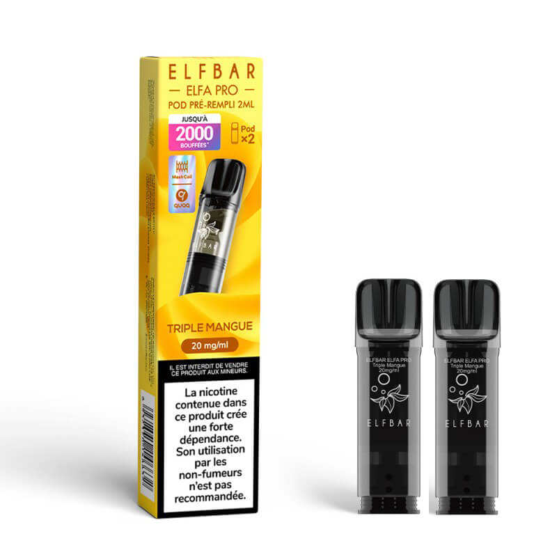 Pack de 2 Cartouches Elfa Pro Triple Mangue, à associer à la Batterie Elfa pour composer votre Puff Elfa. Des cartouches jetables créées par Elf Bar.