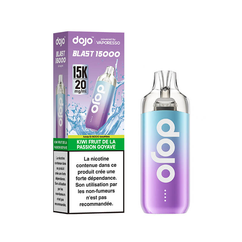 Puff Dojo Blast 15000 Kiwi Fruit de la Passion Goyave de Vaporesso. Ne jetez plus votre Puff ! Un Vape Pen durable, rechargeable et remplissable, prêt à l'emploi, pour une utilisation simple et pratique. Il se compose d'une batterie de 1000mAh rechargeable (câble USB vendu séparément), d'une cartouche remplaçable de 2ml et d'un flacon de recharge, clipsable, remplaçable et remplissable de 8ml pour une autonomie maximale. Lorsque le flacon de recharge de 8ml est vide, il peut être rempli avec des e-liquides de votre choix ou remplacé par une recharge Dojo Blast (vendue séparément). Il conviendra de remplacer la cartouche Dojo Blast 2ml par une nouvelle cartouche, lorsque la résistance scellée est usagée. La Puff Dojo Blast 15K Vaporesso Kiwi Fruit de la Passion Goyave propose un e-liquide savoureux aux notes exotiques de kiwi, de fruit de la passion et de goyave. Elle fonctionne par activation automatique, en aspirant. La puff Vaporesso Dojo Blast Kiwi Fruit de la Passion Goyave offre environ 15000 bouffées. Une capacité améliorée grâce à la nouvelle résistance Corex Blast. Elle est proposée aux sels de nicotine, au taux de 20mg. Dimensions : 10.3cm x 3.6cm x 2.5cm. D'autres cartouches de saveurs sont proposées séparément.